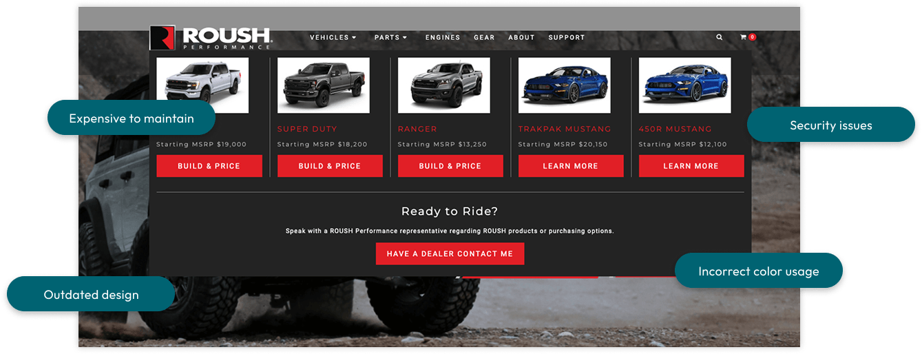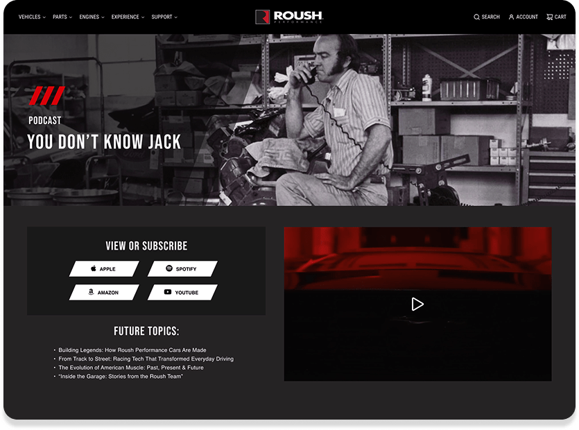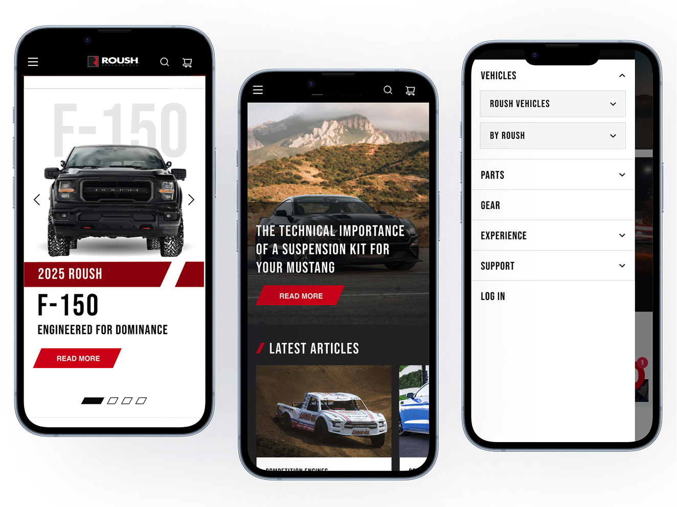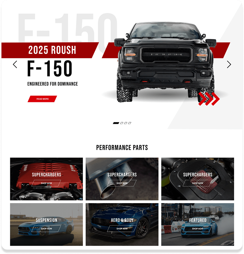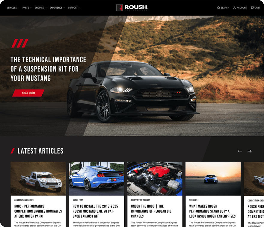 Roush Performance’s legacy Magento 1 site was becoming a roadblock. The design felt outdated, the platform required constant custom development, and maintaining security and PCI compliance was increasingly challenging. It no longer reflected the brand’s innovation or supported their growth goals..